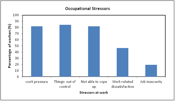 Among the various stressors, ‘things happening outside of control’ at work had the highest impact on most of the subjects (84.5%), followed by work pressure (81.9%) and not being able to cope with work pressures & demands (81.9%). Work related dissatisfaction such as work allocation/dissatisfaction with promotion or rewards and interpersonal issues with peers or managers related to work had moderate impact on the participants (46.5%) and job insecurity was found to have had the least impact among all the stress factors (19.5%).