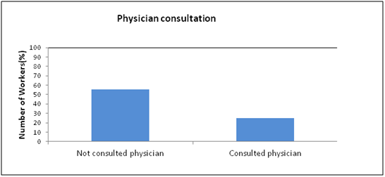 MSDs are really disabling when it lasts for prolonged duration which can result in chronic sickness, absence and loss of productivity at work, having a dramatic impact on the individuals’ ability to stay in the labor market and remain productive18 apart from reducing the quality of the life for the individual.24 Though such situation warrants consultation with the physician to improve the health condition of the employee, in the current study, it was found that only one-fourth of the affected people went to consult a physician (25.8%), whereas the others quoted reasons ‘for not consulting’ as