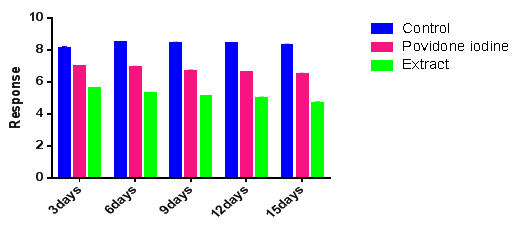 A better healing pattern with complete wound closure was observed in mice treated within 15 days while it took about 25-30 days in control mice with aqueous extract and standard povidone iodine. There was a significant reduction in wound area from day three onwards in treated mice and also on later days the wound closure was much faster than when compared with control mice.