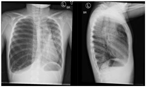 A previously healthy 5 year old female admitted to the Miller Children’s Hospital for right-sided pneumonia was found to have chest radiography (CXR) concerning for right-sided congenital emphysematous lung lesion [1-3]. Her presenting symptoms included shortness of breath with activity limitation and dyspnea with associated generalized abdominal pain. Her only significant past medical history included tonsilloadenoidectomy for obstructive sleep apnea. Her parents also reported a single emergency room visit at one year of age for wheezing, although she was not formally diagnosed with asthma or on controller therapy. She was initially treated with antimicrobials and pediatric pulmonology was consulted regarding her abnormal CXR (Figure 1-7).