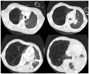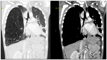 Physical examination revealed right chest diminished air exchange with increased anteroposterior diameter. Flexible fiber optic bronchoscopy demonstrated mucoid impaction of the right main stem bronchus causing ball-valve mechanism leading to air trapping with herniation of the right lung to left. There was also diffuse inflammation of her tracheobronchial tree, distal tracheobronchomalacia, and bronchomalacia of RML and RUL bronchi. Airway clearance was added. CTA revealed severe hyper expansion of the RML with multiple cysts that occupied the majority of her right hemithorax and left mediastinal shift. Lung V/Q scan showed minimal contribution by the right lung of only 11.3% with minimal perfusion.