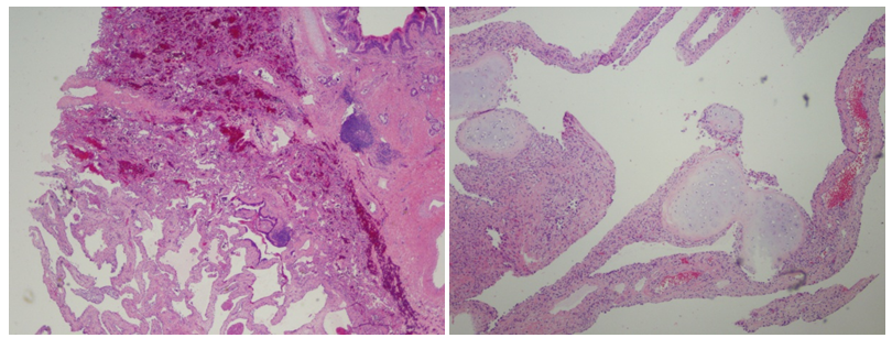 Histopathologic diagnosis of the RML lobectomy and supplying bronchus resulted pleuropulmonary blastoma, regressed type 1r. Given the rarity of this lesion, the case and pathologic specimens were sent for review at the international pleuropulmonary blastoma registry in Minnesota, USA with diagnostic consensus.