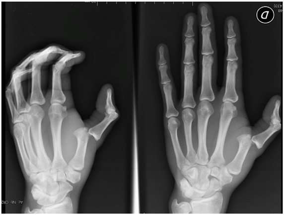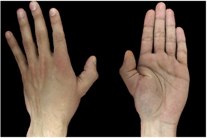 30-year-old male, right-handed, construction worker suffered from a thumb hyperextension trauma 3 days prior to the consultation. He presented with pain, dysfunction, edema, a shortening of the thumb, posterior displacement of the proximal phalanx and palmar palpation of the head of the first metacarpal (MC) bone (Figure 1).