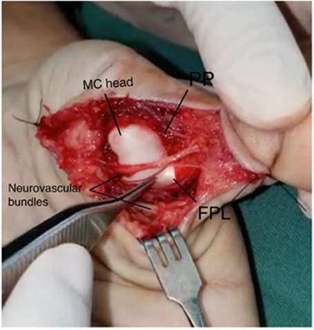 Figure 3 Intraoperative finding (MC: metacarpal; PP: palmar plate; FLP: flexor pollicis longus tendon).