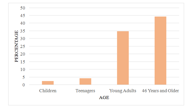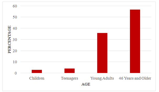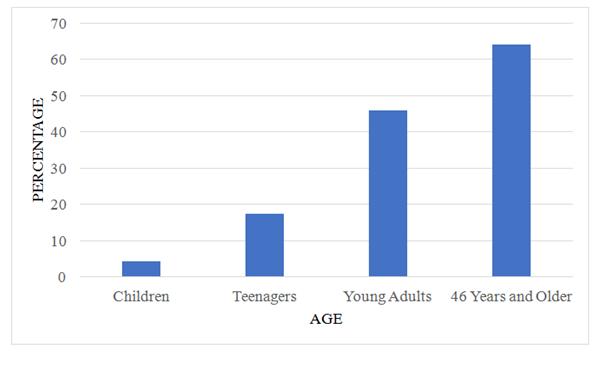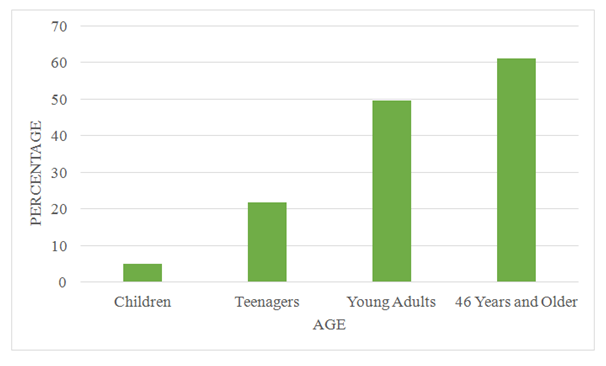 Children have prevalence rate at 3%. The prevalence rate is slightly higher in teen agers, it is at 4.1%. In young adults, the rate is sharply increased, it is at 35.8%. In 46 years old and over ladies, the rate is too high; it is at 56.7% (Figure 5).