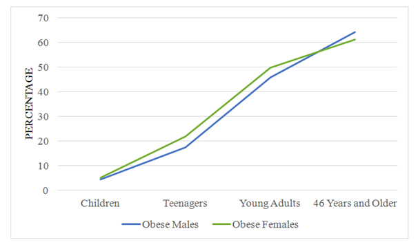 Children have the lowest prevalence rate of morbid obesity; it is at (4.4%). Teen agers have morbid obesity prevalence rate at (17.4%). Young adults show prevalence of morbid obesity rate at (45.8%). These figures fall far behind those in the 46 years and over, in which the morbid obesity rate is at (64%) (Figure 1).