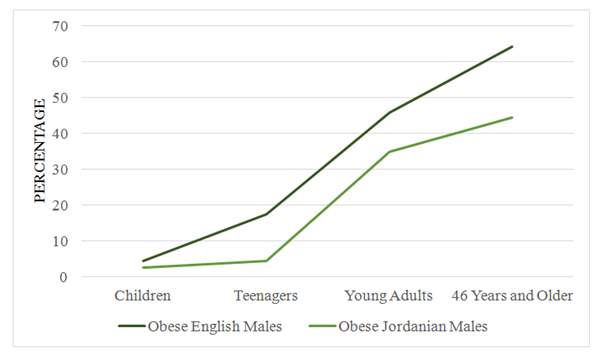 Linear graph shows that the white English people develop morbid obesity right away from childhood, and the prevalence increases progressively with age. In comparison with the Jordanians, the latter shows minimal prevalence rates among children and teen agers; the prevalence rises up among the young adults and elderly people, but still, the rates are lower than those among the white English people (Figure 8).