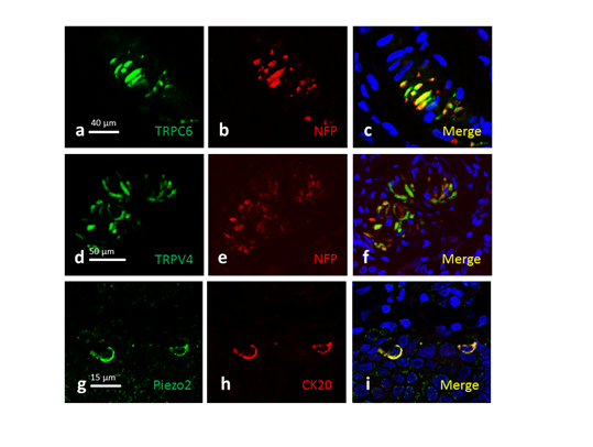Figure 1 Double immunofluorescence for TRPC6 (a), TRPV4 (d) and NFP (neurofilament proteins, b,e) in human digital Meissner corpuscles. Both ion channels are localized in the axons supplying these corpuscles (c and f). The Merkel cells identified because display cytokeratin 20 (CK20, h) express Piezo2 (g and i). Objective 40x/1.25 Oil; pinhole airy 1, XY resolution 156 nm and Z resolution 334 nm.