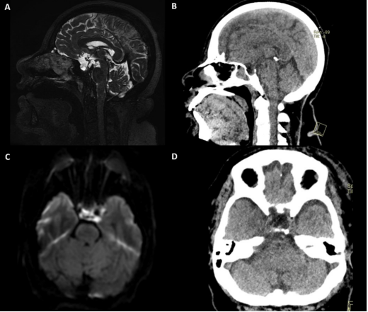 Figure 1 Preoperative MRI compared with postoperative CT. A. MRI. T2-weighted sagittal view with hyperintense lesion with suprasellar, parasellar and retrosellar extension of left predominance that displaces the pituitary stalk and involves blood vessels. B & D. Hypodense image confined to the sellar region and postsurgical changes that demonstrate absence of occupational lesion with modification of the anatomy towards normality. C. DWI sequence shows a hyperintense lesion with respect to the brain parenchyma, causing diffusion restriction.