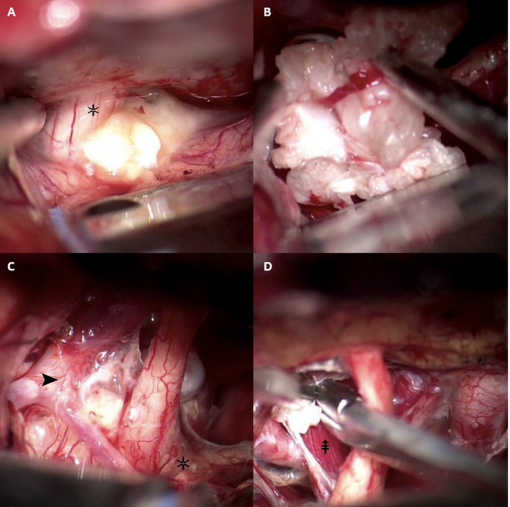 Figure 2 Microsurgical resection of a lesion with a cheesy aspect and pearly white coloration. A) Tumor compressing the left optic nerve (✲). B) Removal and limitation of the tumor edge; decompression of the sellar cistern. C) Exposure of carotid bifurcation (➤) and optic chiasm after surgical decompression. D) Tumor resection through the opticocarotid triangle observing the hypophyseal stalk that was previously displaced dorsally (⇞).