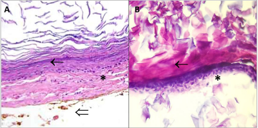56-year-old female with clinical history of systemic arterial hypertension, carbohydrate intolerance, and dyslipidemia with current management of her comorbidities; no hormonal symptoms or laboratory abnormalities were reported. The patient showed at the Neurosurgery department reporting visual disturbances of her right eye and intermittent oppressive headache in frontal region, being previously assessed by the ophthalmology service and diagnosed with right temporal hemianopsia; however, the imaging study showed a multilobulated cystic lesion in the suprasellar and retrosellar region that invaded the left optochiasmatic cistern with ipsilateral extension that caused retraction of the pituitary stalk. MRI showed restricted diffusion on DWI and increased signal intensity on T2 sequence (Figure 1). For this reason, we decided to perform a left transciliary supraorbital approach; making a 4 cm incision and a craniotomy approximately 30 mm wide x 20 mm high, observing a pearly, soft, and avascular lesion, mostly invading the left optochiasmatic cistern that involved neurovascular structures (left carotid artery, optic nerve left and optic chiasm) (Figure 2). A complete resection of the lesion was performed, without complications, allowing us to discharge the patient in the first 72 hours. The histopathological report showed a keratinized stratified squamous epithelium confirming the diagnosis of an epidermoid tumor (Figure 3).