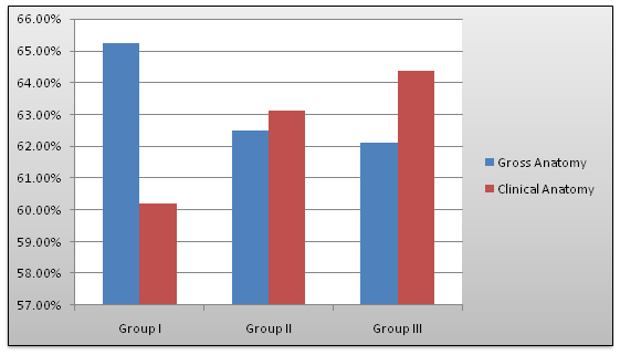 Anatomists can demonstrate the gross anatomy of a particular region, with the help of dissection procedures, prosected specimens, illustrations and photographs while a surgeon can demonstrate the same, either on the patient or during actual surgical procedures. This plays a very constructive role in make the learning of anatomy more realistic and effective. The student learns the detailed anatomy & common anatomical anomalies of that particular region from the anatomist, whereas a surgeon demonstrates the same structures in layers during a surgery.4,5 What makes this type of teaching different from a typical anatomy course is that, it goes beyond simple identification. It is in fact, anatomy seen in a clinical setting. It also helps to accomplish the goal of vertical integration and improves on what is taught by the anatomist. This approach, of a classical anatomic perspective is very different from a surgical perspective. They are nearly opposites. In the typical anatomy course, a wide section is opened in a cadaver, so students can view as much as possible, but in a surgical procedure, the smallest incision possible is made and structures are viewed.6 Thus, the practical aspect is stressed upon, starting from how anatomical knowledge is applied and working backwards from the objectives to the factual details. This makes Anatomy so much more relevant-suddenly it becomes essential to know not only the one course of a vessel traditionally described in textbooks, but also its anatomical variants. Basically, students no longer learn for a test, but for their professional life.7 The present study was designed as an investigational study to reveal whether a clinician can teach better clinical anatomy, as he has practical exposure to real situations, as compared to an anatomist who has only theoretical or textbook based knowledge.8 The aim of the present study was to evaluate any difference in the level of knowledge of gross and clinical anatomy among first year MBBS students when taught by Anatomist alone; Clinician alone and by both anatomist and clinician.