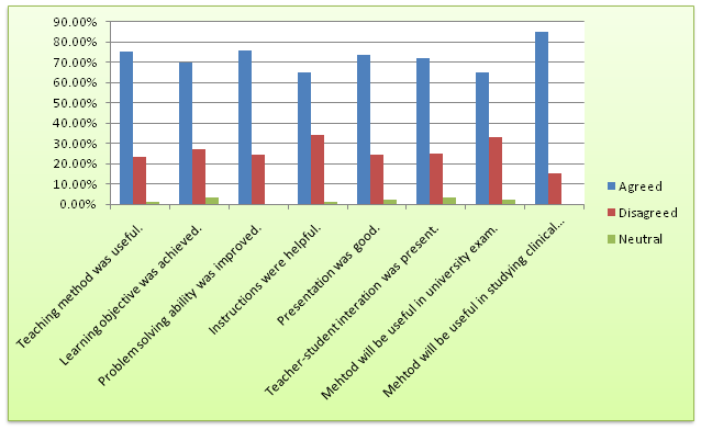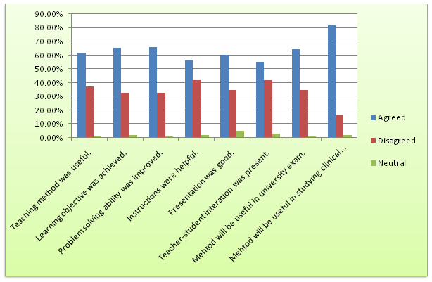 The questions of every test paper were categorized into two parts- [i] gross anatomy [ii] clinical anatomy. Marks obtained by each student were converted into percentage. Knowledge acquired by the students of respective groups was measured in terms of test percent scores. To analyse the student’s perception, regarding the teaching methods, they were subjected to, a structured questionnaire which was given to all the 45 students and a feedback was obtained (Figure 1‒5).