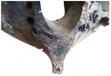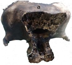 The sex of the suspected Asian elephant was determined based on the morphology of skull.5 The following findings played important role in determining the sex of the animal. The Parieto-occipital crest was found to be rounded and somehow convex on the dorso-median region of the skull (Figure 1), in contrast the said crest is reported to be concave or distinctly depressed on the median plane of the dorsal boarder of the skull of a male elephant. On examination of the postero-medial wall of the temporal fossa of the suspected elephant no temporal line was observed, rather, the area was smooth. As per literature, if the temporal line is present on the postero-medial wall of the temporal fossa of the skull of elephant, then it belongs to male sex. Therefore, absence of temporal line in the said location of the suspected elephant skull authenticates its female sex (Figure 2). On examination of the lip bone of the mandible of the suspected elephant, which is located as a median projection from the anterior end of the mandibular symphysis, it was found to be thin, short and pointed (Figure 3). This is the character of lip bone in case of female elephant. However, in case of males, this bone appears to be elongated, dropped downwards and somehow thick and broad. From the above three gross morphological observations on the skull bones of the suspected elephant, it was concluded that probably the suspected dead elephant was a female one.
