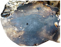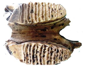The age of the Asian elephant depends on the number of closed loop called lamellae or lamina on the table surface of the molar tooth (Figure 4). In the present study, it was found that the enamel fold pattern on the table surface of the upper (6”x2.5”) and lower 3rd molar (6”x2.5”) revealed about 9 close looped (U-shaped) lamellae.7 On comparison with the literature on the dentition pattern of the Asian elephant, It was found that the second molar (eight no. of loops) totally replaced by third molar by 6th year and one extra loop was about to grow.8 So, the approximate age of the animal was speculated to be 6years.
