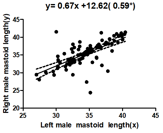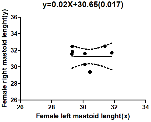 However there is dearth of information on the mathematical models of this craniometric parameters.15 There was no correlation between left versus right female mastoid length and the fit line was straight while positive regression coefficient indicates a positive relationship between two variables and from the graph the fit line sloped upward as in male mastoid length left versus right.