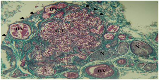 Figure 1 Photomicrograph of a section of the carotid body and surrounding structures. The cellular glomic tissue (GT) is lobulated (l) and surrounded by a connective tissue capsule (arrowheads). It is abundantly supplied by nerve bundles (N) and blood vessels (BV). Mason’s trichrome stain x100.