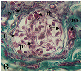 B. 3 yr old female specimen, note blood vessels (BV) and nerves (N) within the glomic tissue (Gt). X100.