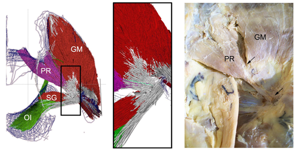 Layers of digitally traced muscle and tendon fibers are peeled back in approximately 1 mm thickness to reveal deeper layers, which are also subsequently digitized. The entire volume of muscle and tendon fibers are digitized into a wireframe model and then reconstructed in Autodesk Maya into rendered tubes. Additional deep hip rotators such as the SG, and OI were also digitized.