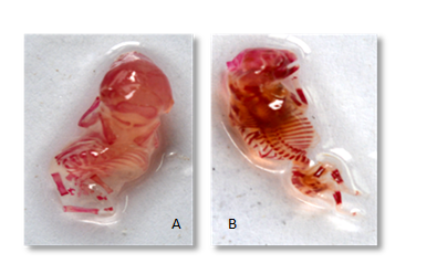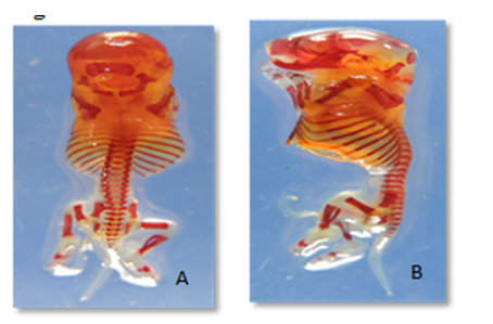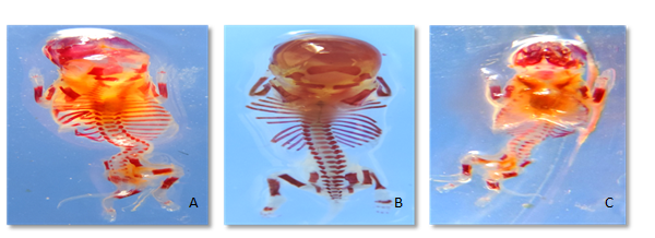 On GD 18, right and left horns of uterus of pregnant mother were exteriorized following ventral laparotomy under deep ether/chloroform anesthesia and 250 fresh collected dams through dissection were washed with tap water on Petri dish to remove blood and amniotic fluid and dried by filter paper and dehydrated in 95% alcohol for 48hrs at last exposed to 1% KOH for consistence evisceration and Alizarin staining protocol for proper visualization of bones either normal or abnormal.13