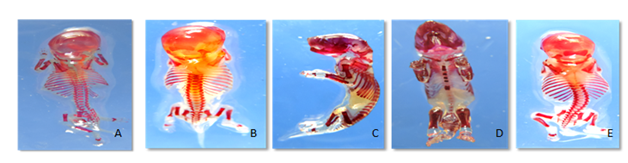 In total 250 fetuses were collected from 25 mothers from 1, 2, 3, 4 and 5 groups out of which all samples were exposed to skeletal dysmorphology experimentation. 60 fetuses were observed resorption.