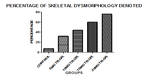Percentage of skeletal malformation was evaluated from each group and assessed by number of bone involved in the dysmorphology and finally the percentages were compared between the group and within the group for dose dependant teratogenicity factor. Multi ANOVA and Descriptive statistics (post hoc analysis) test used for this purpose.