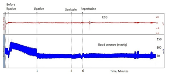 ECG recording was measured by subcutaneous needle electrodes. ECG and blood pressure were recorded during ischemia and reperfusion by computerized recording system (Biopac System Inc Goleta CA USA, Turkish representative Commat-Ankara/Turkey) using BSL Pro 3.7 software. The type of ventricular arrhythmia, the duration of each type of arrhythmia and total arrhythmia were determined in six minutes ischemia and six minutes reperfusion period. Arrhythmias were classified according to the Lambeth conventions.12 According to the type and duration of arrhythmia, an arrhythmia score was determined.13 The heart rate and blood pressure before and following ligation and reperfusion at 1st, 3rd and 5th minutes were determined from ECG and blood pressure recordings. Time scale and recording in acute and long-term genistein administered group were shown in Figure 1 & 2.