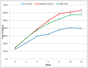 The three groups of rats gained weight at different rates. There were no significant differences in weight gain among the rats. The NBC treatment group, overall, had lower body weights than the Diabetic control group, forweeks 4-12. The Lean control group had the lowest body weight for all time points (Figure 1).