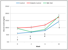 Glucose levels in the NBC treatment group were significantly higher atweeks 0 and 12 than those in the Non-Diabetic Control rats and significantly lower than in the Diabetic Control rats atweeks 2 and 6. Fasting blood glucose levels in the Diabetic Control rats were higher at allweeks than those in the Non-Diabetic Control rats. NBC supplementation did improve fasting blood glucose levels after initiation of diet, but did not improve fasting blood glucose levels at the termination of the experiment (i.e., 12weeks) (Figure 2).