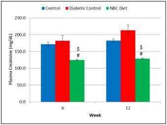 Plasma creatinine levels in NBC rats were significantly lower atweek 6 andweek 12 than those in the Non-Diabetic Control rats and in the Diabetic Control rats (Figure 3). Plasma creatinine levels in the Diabetic Control rats were higher at allweeks than those in the Non-Diabetic Control rats. NBC supplementation did improve plasma creatinine levels after initiation of diet and throughout the 12weeks of feeding (Figure 3).
