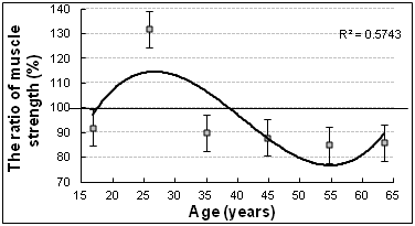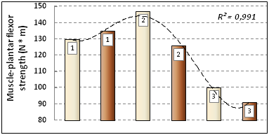 In patients of group 2 (with osteoarthritis), the ratio of the strength of the posterior group of muscles of the affected and intact tibia in 17-23 years was 88%±4, in 24-31 years 111%±5 and in older age 90%±3. The increase in 24-31 was statistically significant (p<0.006, Figure 3).