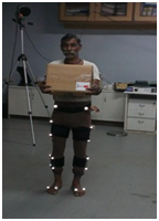 Twenty healthy male construction workers from Mumbai suburb area without any past history of orthopaedic surgery were selected for this study. All the workers involved in load carriage task on a regular basis for more than five years of experience. Their ages ranged from 21 to 40years. Written consent were obtained and then a screening examination was conducted to ensure each worker was free of clinical orthopaedic problems in the spine and legs. Thirty six reflective markers were placed on each worker’s legs and pelvis in total. The worker’s lower body, starting from the pelvis to foot, was provided with the markers. The specified markers, which validated the Visual 3D to reassemble the digital skeleton of each worker, included the following: Pelvis defined by the markers placed on right and left anterior and posterior superior iliac spine. Hip was defined by markers on distal endpoints at the left and right greater trochanter. The markers placed on proximal endpoints for thighs were the distal pelvis endpoints and the distal endpoints for thighs were the lateral and medial epicondyle on left and right legs. The proximal endpoints markers for the shank were the thigh’s distal end points and the distal endpoints for the shank were the lateral and medial malleolus on left and right legs. One heel marker for each left and right legs was placed on the posterior side of the calcaneus. Two markers were placed on the first and fifth metatarsal bone to define foot of each legs. Markers tracked by the cameras for both static and dynamic trials.
