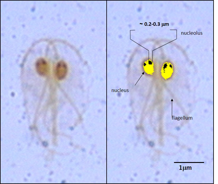 G. Lamblia displays the smallest nucleoli so far described in nature. It is about 0.2-0.3µm large, which is also about the resolving power for standard light microscopy. The reason of why it was not observed before, may have to do with its size and the use of fluorescent probes that, even they are so specific, however they do not display the highest contrast. On the other hand, silver staining for nucleolar organizer offers the highest contrast when analyzing by bright field light microscopy. The first observations suggested that a fine study had to be made with TEM. The best fixation techniques and further cytochemical, immunocyto chemical and in situ hybridization techniques at the ultrastructure level confirmed that nucleolar material was present in G. Lamblia. A fibrous and granular component characterizes an intranuclear region. Further analysis with transfection of the gene for the rRNA-pseudourydine synthase or fibrillarin also confirmed the presence of a nucleolar domain within the nuclei of G. Lamblia.14