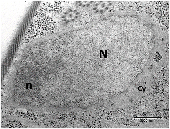 Figure 2 Transmission electron microscopy of G. lamblia nucleolus. Nucleolus (n) is present at the periphery within the cell nucleus (N).