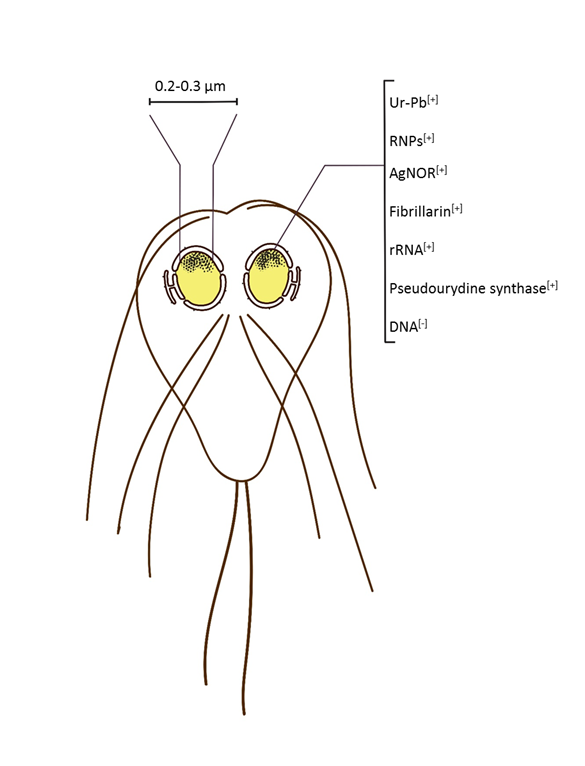 Figure 3 Drawing of G. lamblia showing the nucleolus in both nuclei of the cell summarizing the different nucleolar markers tested. Ur-Pb [+], positive in samples contrasted with uranyl acetate for standard transmission electron microscopy; RNPs [+], positive for the EDTA regressive staining for ribonucleoproteins; AgNOR [+], positive for silver staining for nucleolar organizer region; Fibrillarin [+], positive for immunoelectron microscopy for nucleolar protein fibrillarin; rRNA [+], positive for high resolution in situ hybridization for rRNA; pseudourydine synthase [+], transfection for expression of this protein; DNA [-], negative for immunoelectron microscopy for DNA.