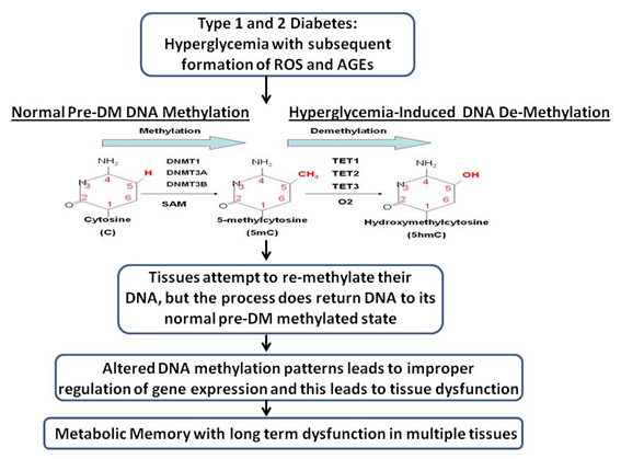 A major clinical problem associated with type 1 and 2 diabetes is the debilitating long term complications seen in this disease. While many tissues are affected in DM, pathologies associated with the endothelial cell are often central to these tissue problems. With the identification of epigenetic changes, (e.g. tissue-specific DNA methylation, direct DNA methylation within pancreatic b-cells,105,106 histone modification, etc.) as processes associated with both DM and MM, investigators now have another potential target for investigation of the molecular mechanisms that may explain the persistent dysfunction seen in the many tissues affected in this disease. The combination of epigenetic analysis and endothelial cell function could lead to the identification of molecular targets for therapeutic intervention for the treatment and possible prevention of secondary complications of this metabolic disease. A general summary of the events associated with changes in DNA methylation patterns in diabetes is depicted in the article (Figure 1).