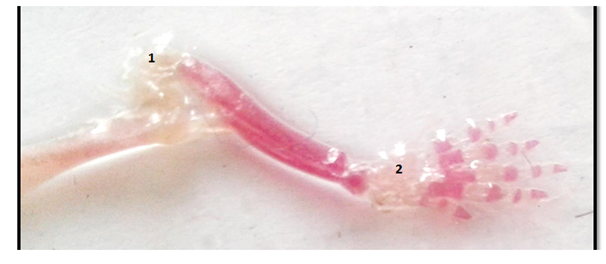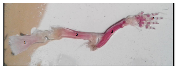 Alizarin Red is an anthraquinone derivative used to identify calcium in tissue sections. Calcium forms an Alizarin Red calcium complex in a chelation process, and the end product is birefringent. In the present study, ossification of the bones of rabbit embryos was determined. Most of the forelimb bones were already in the process of ossification at 24-day-old age (Figure 1). It is reported that a primary ossification centre was visible at day 15 of pregnancy in mouse.5 The diaphysis of the lone [long] bones like of humerus, radius and ulna showed the ossification but their epiphyses were still cartilaginous in nature. It is recorded that the primary ossification centre formation in diaphysis of radius and ulna in 43-day-old embryos.6