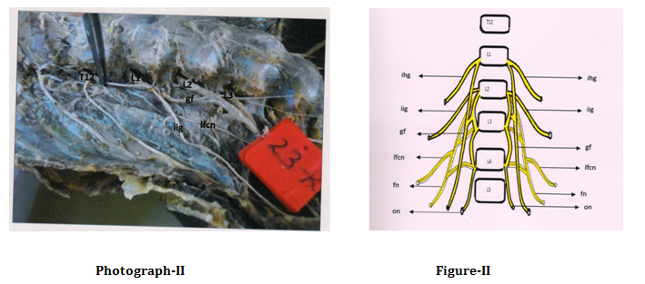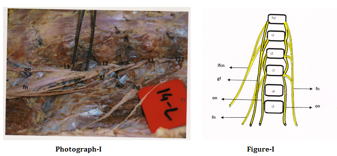 Two female cases of the genitofemoral nerve (1 case of right side and another 1 case of left side) i.e. (3.33%) of cases were arising from the root value of T12 and L1. These were present in two different female cases and were unilaterally present. No such variation was found in males (Photograph 1 & Figure 1). 1 case (1.67%) of cases in male on left side was having the root value of L1. It was a unilateral case. No such variation was found in female.
