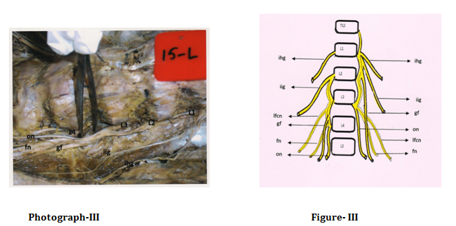 L1, L2 and L3 root value of the genitofemoral nerve was found in 3 male cases. 2 cases (3.33%) were bilateral in origin while 1 case (1.67%) male was unilateral in origin on left side. No such variation was found in females (Photograph 3 & Figure 3) .