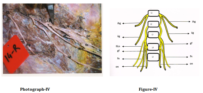 4 cases (2 cases 3.33% on right side, and 2 cases 3.33% on left side) in males were arising from the root value of L2 only. These were bilateral in origin. No such variation was found in females. 1 case (1.67%) in males on right side, 1 case (1.67%) in females on right side were arising from the root value of L2 and L3. Both the cases were unilateral in origin, and arising on the right side only (Photograph 4 & Figure 4).