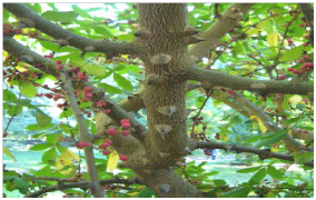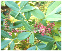 The flowering season starts in July and ends in August. Male flowers: stamens 4-6; anthers yellow prior to anthesis; connective apex with oil gland; disk pulvinate; rudimentary carpals lacking. Female flowers: carpels 2 or 3, axially often with a conspicuous oil gland; styles recurved; staminodesligulate or lacking (Figure 3). The fruiting season begins in October to November. Fruit follicles usually purplish red, 4-5 mm in diameter, with a few protruding oil glands (Figure 4). Seeds, blackish brown, 3-4 mm in diameter. Seed are rounded, 3 mm in diameter, shining black. The prickles often vertically flattened on the trunk and branches the older with corky base, it rapidly changes color on exposing to light from yellowish brown to dark brown. bark pale brown in color, texture is rough croaky, leaves are alternate imparipinnate.7 (Figure 5).