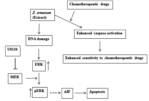 Sixteen medicinal plants extracts were screened from North east part of India and found that the leaf extract of Zanthoxyllum armatum (ZALE) induced cytotoxicity. Zanthoxyllum armatum leaf extract have the potential effect on increasing the efficiency of chemotherapeutic drugs like camptothecin, mitomycin C and cisplatin.34 In this study, HeLa cells with 80µg/ml was treated with ZALE for almost 48 hours. It shows morphological changes and cytotoxicity in dose dependent manner. Apoptosis was characterized by membrane blebbing. To know the molecular mechanism of apoptosis induced ZALE, caspase - 3 activation and PARP (Poly ADP-ribose polymerase) cleavage is analyzed by immunoblotting. Caspases are catalytically inactive zymogen activated by the proteolytic cleavage. The ZALE treated cells does not show caspase 3 activation nor PARP cleavage which suggest apoptosis without activating caspase 3 and PARP cleavage. Recent reports also show ZALE activates the MAPK (mitogen-activated protein kinases) pathway. Further to investigate, whether the plant extracts enhance apoptosis induced by chemotherapeutic drugs, HeLa cells with low dose approximately 15µg/ml of the plant extract were kept for 16 hours and then exposed to the drug cisplatin for 48 hours. The cell proliferation assay shows greater cell death in combination treatment in comparison to only extract treatment. ZALE shows 70 percent more killing cells which suggests ZALE also augmented chemotherapeutic drugs induced apoptosis (Figure 14).