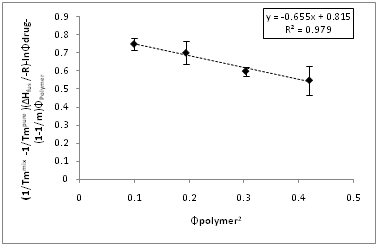 The resultant depressed melting temperatures can be then analysed using Equation (2) and plotted as shown in Figure 2 to estimate Flory-Huggins interaction parameter χ based on the data from the volume fraction of the polymer that yielded a linear relationship (R2 value of 0.9794). The value so obtained was -0.6559; this negative value predicts miscibility.44 Furthermore, this interaction parameter was used to estimate the drug solubility limit based on the following equation: