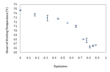The melting point depression of crystalline ibuprofen blended with amorphous Eudragit RS PO was observed with increased volume fraction of this polymer in physical mixes, as shown in Figure 1. The temperature reduction is predicted to be caused by the decrease of the chemical potential of the drug by the addition of a miscible diluent.45