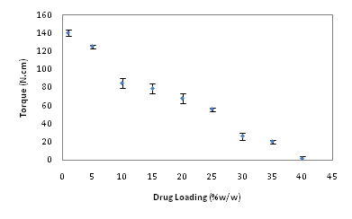 Translucent hot melt extrudates were produced between 1-35% (w/w) drug loading, although opacity was noted at 40% (w/w) drug loading (Figure 3a). It was also observed that torque values inside the extruder decreased as a function of increased drug loading as illustrated in (Figure 3b). This parameter is directly proportional to the viscosity of the molten material, thus implying that ibuprofen decreased the melt viscosity via its role as a plasticizer.47-48