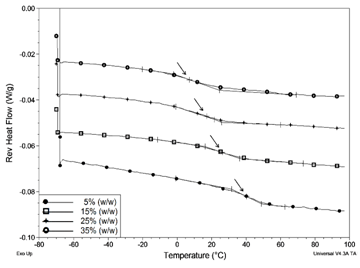 Representative reversing heat flow signals of MTDSC data of these samples stored under elevated humidity conditions are given in Figure 11a-c. The glass transition temperature was assigned accordingly from these signals and notably it was lowered to values ranging from 31.7±0.1 °C and 9.6±0.2 °C for the fresh 10-30% ibuprofen loaded systems to 25.1±0.4 °C and 3.2±0.2 °C, respectively, before any recrystallization was detected. Water contents of approximately 1.14 wt. % and 0.84 wt. % for the 10% and 30% loaded systems, respectively, were measured using TGA after one month of storage at 60% RH/25 °C. This would imply the critical role of water as a plasticizer for these extruded samples, as even small amounts of water were sufficient to depress the glass transition temperatures of these systems. Furthermore, it was observed that a melting endotherm, ascribed to ibuprofen melting and hence prior recrystallization, appeared at drug loadings higher than 10% (w/w).