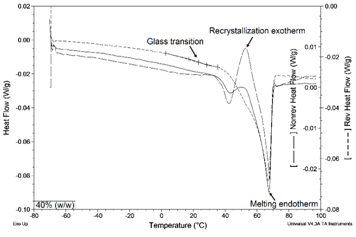 Physical characterisation: Conventional DSC and modulated temperature DSC (MTDSC) measurements were performed using a Q1000 DSC (TA Instruments, USA) equipped with a refrigerated cooling system (RCS). Temperature calibration was performed using indium, benzoic acid and n-octadecane, while heat capacity calibration was performed using aluminium oxide. Data were analysed using TA Universal Analysis Advantage Software v5.5.3. Nitrogen was used as the purge gas through the DSC cell at a flow rate of 50ml/min. TA instruments standard pans were used for all calorimetric studies and the mass of each empty sample pan was matched to the mass of the empty reference pan within ±0.05mg; all measurements were performed in triplicate.