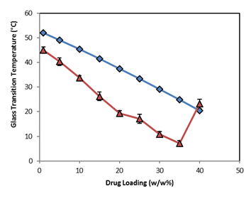 Where ρ1 is the density of component 1 and ρ2 is the density of component 2. The densities are 1.05g/cm358,59 for ibuprofen and 0.57 g/cm3 for Eudragit RS PO. Using Equations 4 and 5, the predicted theoretical values of glass transition temperatures of the binary extruded systems of ibuprofen (component 1) and Eudragit RS PO (component 2) with varying compositions is shown in Figure 5. As can be seen from this Figure, the experimental data deviate negatively from the theoretical values obtained from the G-T equation up to 35% (w/w) drug concentration. However, at 40% (w/w) ibuprofen loading an increase of the glass transition temperature was observed which almost meets with the predicted or theoretical value derived from the G-T model. It is therefore suggested that a degree of super saturation has occurred, which is negated when the dissolved excess drug crystallizes out, and hence less of plasticizing effect.