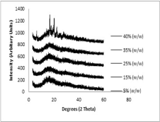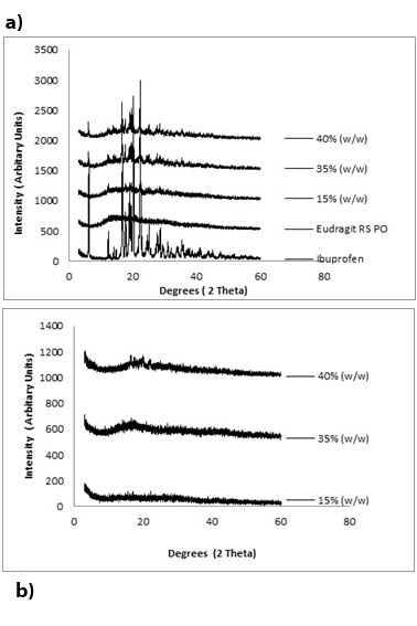 (Figure 6a) and (Figure 6b) show an overlay of the X-ray powder diffraction profiles (diffract grams) of the physical mixtures of ibuprofen in Eudragit RS PO at different drug loadings in comparison to their equivalent hot melt extrudates. The diffraction peaks appeared in the physical mixtures over the concentration range 1-35% (w/w) of ibuprofen were absent in all diffract grams of the equivalent extrudates, which showed broad halos, indicating amorphicity of the extruded systems. However, at the higher ibuprofen content of 40% (w/w), extruded system showed clear diffraction peaks related to the crystalline ibuprofen (Figure 6b).