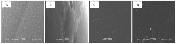 Microscopic examination using SEM of the fresh hot melt extruded systems of ibuprofen and Eudragit RS PO is shown in Figure 7. The surfaces and cross sections of these extruded systems up to 35% (w/w) drug loading were observed with no visible drug crystals, supporting drug miscibility within the Eudragit RS PO matrices. However, ibuprofen crystals were visible on both the surface and the cross section of the extruded system at 40% (w/w) drug loading, suggesting that ibuprofen content exceeded the drug solubility in the polymer Interestingly, increasing drug loading enhanced the smoothness of the surfaces and the elasticity during the cutting of the extruded systems, which again may be ascribed to ibuprofen plasticizing effect.